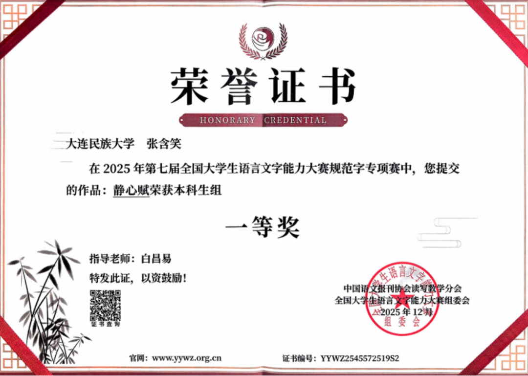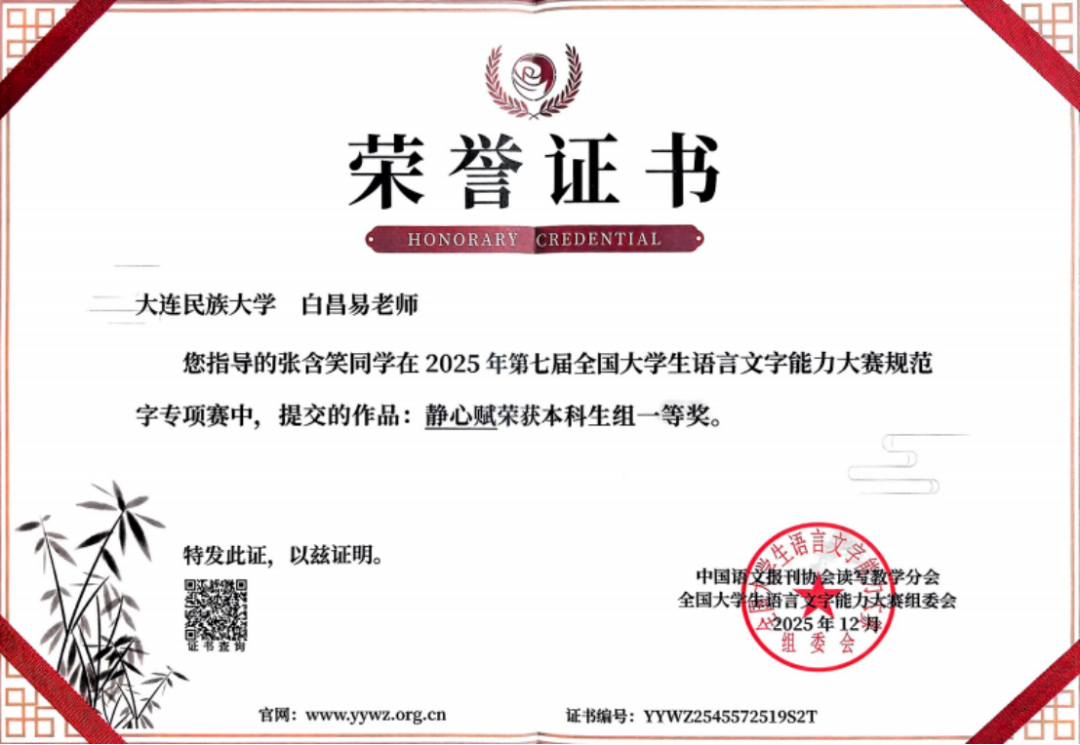 近日,2025年第七届全国大学生语言文字能力大赛专项赛获奖名单揭晓。经济管理学院行政管理专业本科生张含笑,在班导师白昌易老师悉心指导下,凭借《静心赋》斩获本科生组全国一等奖。这是行政管理专业学子在语言文字类国家级学科竞赛中取得的重要成果,彰显了学校人才培养成效与学院专业育人实力。