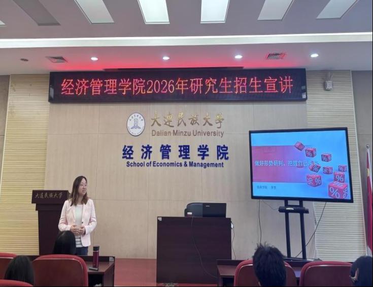 为帮助学生精准把握考研形势、了解学院硕士学位点招生情况,切实为学生升学规划提供专业指导,近日,经济管理学院成功举办2026年研究生招生宣讲会。学院党委书记赵靓出席活动并做开场致辞,强调本次宣讲会旨在帮助同学们全面了解学院硕士点建设成果、培养特色及招生政策,为后续备考与报考提供清晰指引。国际商学院李旻院长、经济管理学院吴英慧和马天教师受邀担任主讲嘉宾,学院各年级有考研意向的学生参加了此次活动。本次宣讲会由学院副院长赵奥主持。