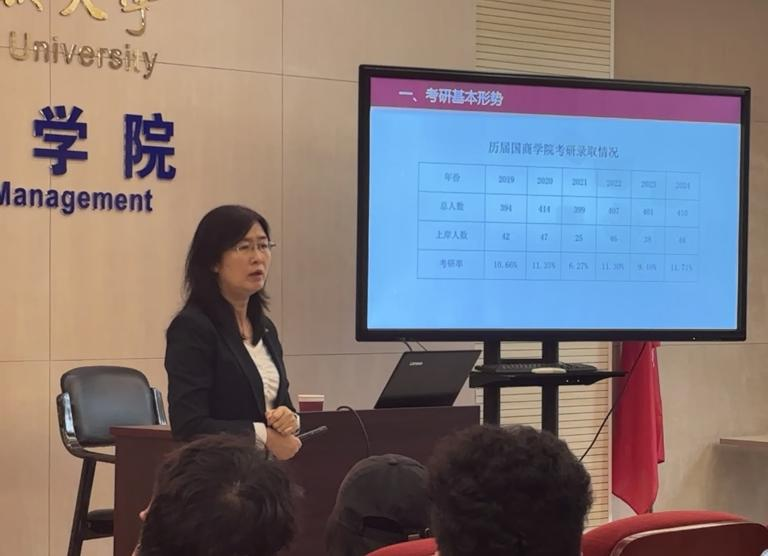 宣讲环节,李旻院长以“做好形势研判,把握自己未来”为题,解读考研形势、选校逻辑与注意事项。吴英慧老师围绕数字经济硕士点,系统介绍该方向的就业前景、培养特色、考试科目设置及首届在读学生培养情况。马天老师聚焦旅游管理硕士点,详细阐述该学位点的特色优势、研究方向、师资队伍构成、毕业生就业去向及备考核心要点。