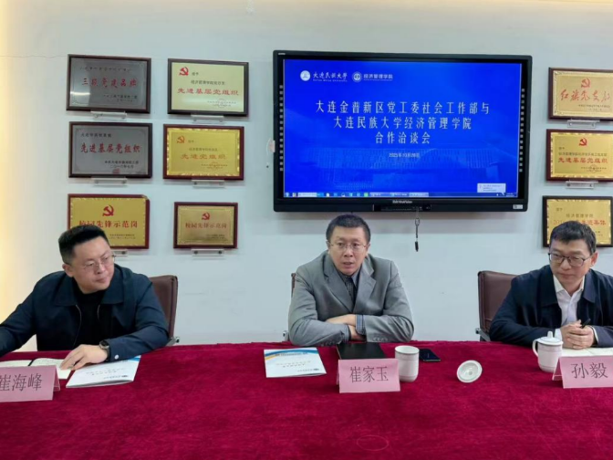 为响应学校党委“两个千方百计、一个全力以赴”的就业工作总要求,落实大连民族大学经济管理学院以就业为导向、深化校地协同的发展思路,10月28日下午,大连金普新区党工委社会工作部与经济管理学院在金石滩校区闻道楼201会议室举行合作洽谈会。金普新区党工委社会工作部部长崔家玉、副部长孙毅、办公室主任崔海峰,经济管理学院院长左莉、副院长滕飞、教授刘大志及行政管理系系主任刘堂灯参会。